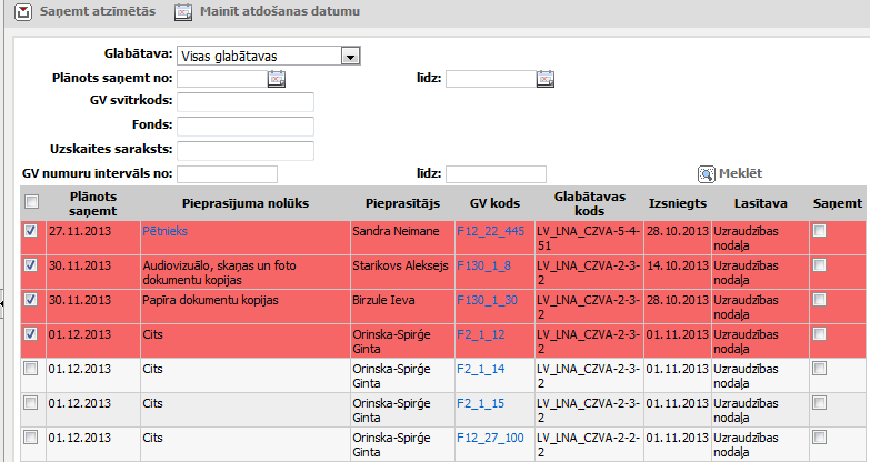 Noklikšķinot veic izsniedzamo glabājamo vienību meklēšanu pēc augstāk norādītajiem kritērijiem. |