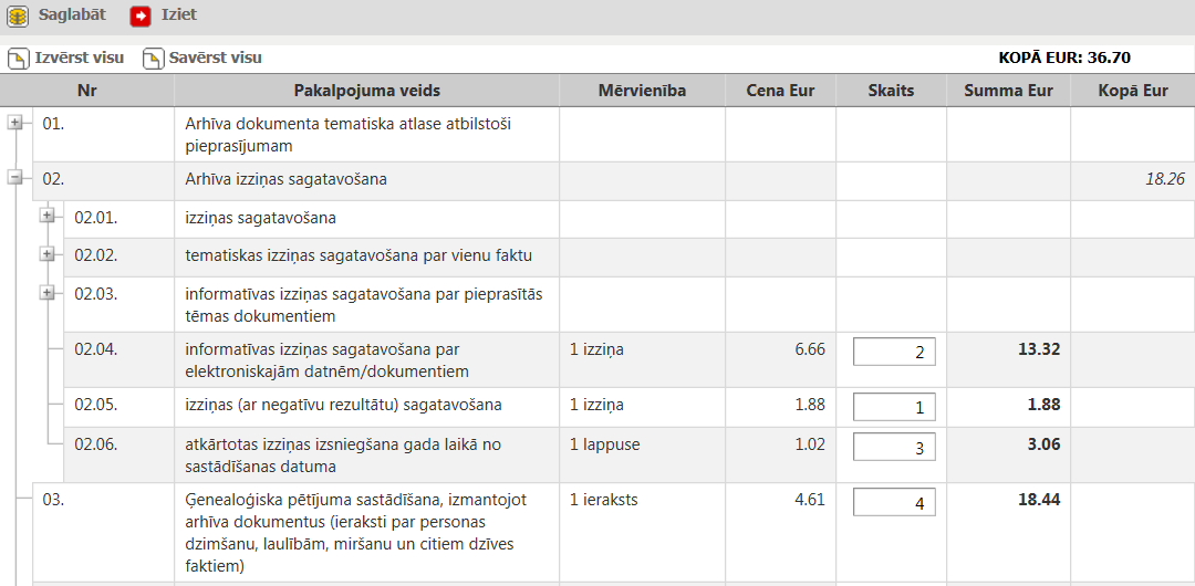 Noklikšķinot sistēma izvērš attiecīgo pakalpojuma veida ierakstu. Darbība nav pieejama, ja pakārtotie ieraksti ir izvērsti. |