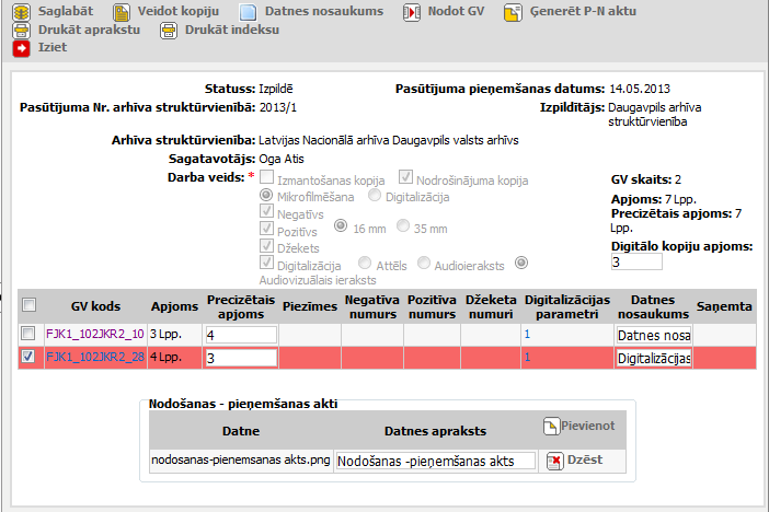 Pozitīva numurs. Hipersaite, kuru noklikšķinot tiek atvērts Kopijas datu ievades logs (skat. aprakstu 18.13 Logs: Mikrofilmēšanas kopiju izveide). Attēlo, ja pasūtīta mikrofilmēšana. |