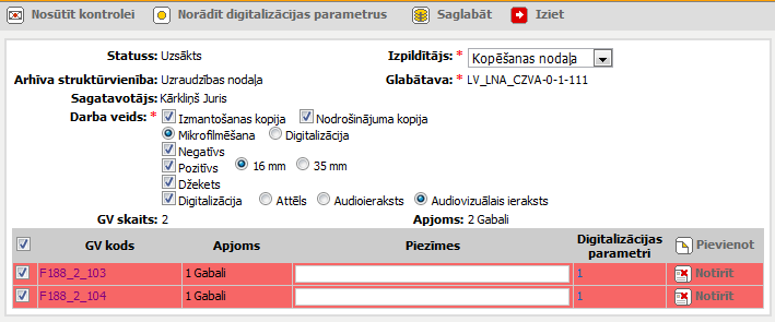 Radiopoga, ja kopēšanas pasūtījums ir audiovizuāls ieraksts. Pieejama, ja atzīmēta radiopoga ‘Digitalizācija’ vai izvēles rūtiņa ‘Digitalizācija’. Pārslēdzot radiopogas, ja kopēšanas pasūtījumā ir glabājamai vienībai ir norādīti digitalizācijas parametri, tie tiek dzēsti. |