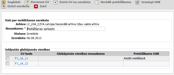 Blokā tiek uzturēta informācija par meklēšanas sarakstā iekļautajām glabājamām vienībām un UAK lēmumu. Bloks pieejams, ja meklēšanas saraksts ir statusā ‘Iesniegts UAK’. |
