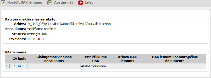 Attēlo tabulu ar meklēšanas sarakstā iekļautajām glabājamām vienībām. Attēlo blokā ‘UAK lēmums’. |