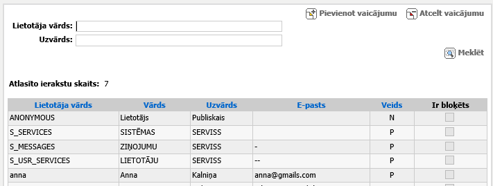 Logs „Portāla lietotāju saraksts” paredzēts administratoram sistēmas ārējā portāla lietotāju atlasei, meklēšanai, datu apskatei.