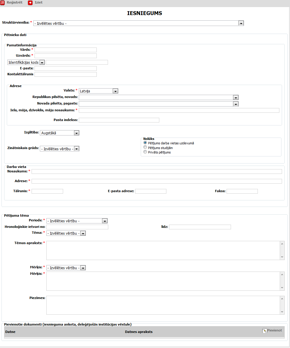 Logs „Pētnieka iesniegums” paredzēts pētnieka iesnieguma (atļaujai pētīt) izveidei sistēmas darba (iekšējā) vidē. Par katru pētāmo tēmu jāveido jauns iesniegums.