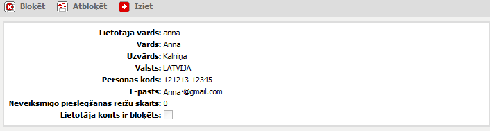Logs „Ārējā lietotāja konts” paredzēts administratoram sistēmas ārējā lietotāja datu apskatei, lietotāja bloķēšanai, atbloķēšanai vai dzēšanai.