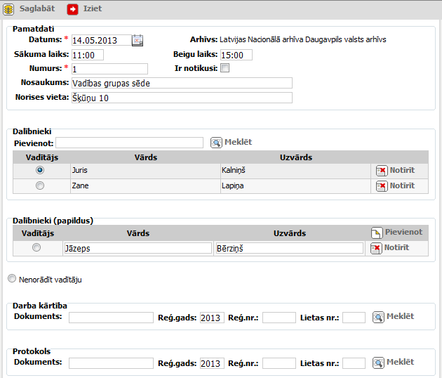 Pazīme, vai sēde ir notikusi. Ja pazīme ir uzstādīta, tad labošanai nav pieejami bloka „Pamatdati” ievadlauki |
