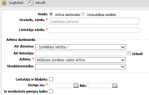 Logs „Sistēmas lietotājs –arhīva darbinieks” paredzēts jauna sistēmas lietotāja izveidošanai.