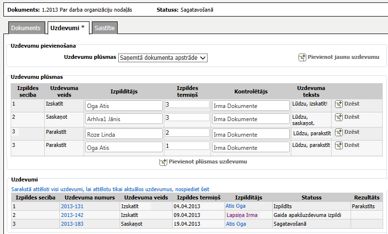 Noklikšķinot uz hipersaites, uzdevumu plūsmas uzdevumi tiek pievienoti uzdevumu sarakstam, aktualizējot uzdevumu statusu un izpildes secību, t.i., ja objektam nav piesaistīts cits uzdevums, kura statuss ir „Uzdots”, „Akceptēts” vai „Noraidīts”, tad plūsmas uzdevumu ar mazāko izpildes secību statuss kļūst „Uzdots”, pārējie – „Sagatavošanā”. Ja objektam ir piesaistīti citi uzdevumi, uzdevumiem tiek aktualizēta izpildes secība. |