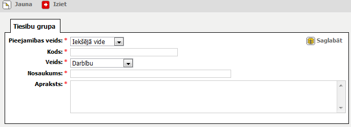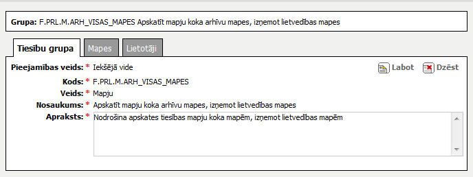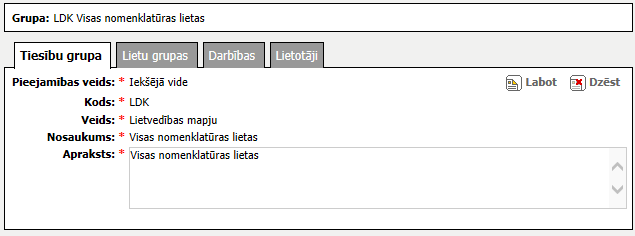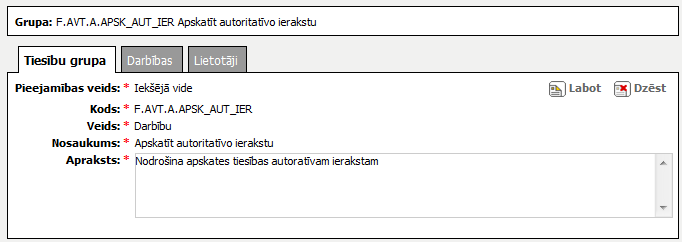 Tiesību grupas kods un nosaukums. Pieejams apskates un labošanas režīmā. |