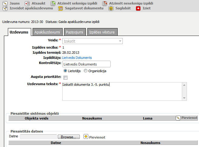 Jauna uzdevuma veidošanai skat. aprakstu 27.3 Scenārijs: Jauna uzdevuma izveidošana.