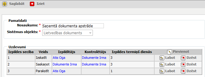Noklikšķinot uz [Labot], sistēma atver uzdevumu plūsmas logu labošanas režīmā. Darbība pieejama apskates režīmā.