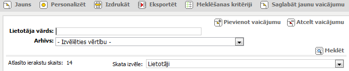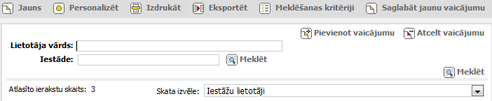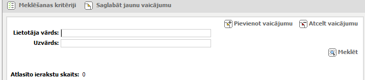 Mapju sarakstā izvēloties mapes ‘Administrēšana’ apakšmapi ‘Iestāžu lietotāji’, tiek attēlots saraksta pārlūka bloks ‘Meklēšanas kritēriji’ ar pēc noklusējuma esošajiem meklēšanas kritērijiem.