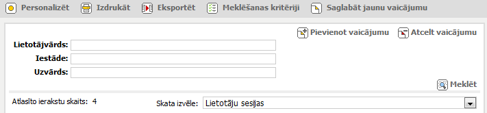 Mapju sarakstā izvēloties mapes ‘Administrēšana’ apakšmapi ‘Lietotāju sesijas’, tiek attēlots saraksta pārlūka bloks ‘Meklēšanas kritēriji’ ar pēc noklusējuma esošajiem meklēšanas kritērijiem.