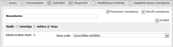 Mapju sarakstā izvēloties kādu no mapēm, tiek attēlots saraksta pārlūka bloks ‘Meklēšanas kritēriji’ ar pēc noklusējuma esošajiem meklēšanas kritērijiem.