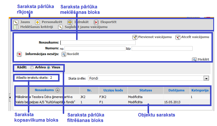 − Kopsavilkuma bloka - ja meklēšanas rezultātā ir atlasīti ieraksti, tiek attēlots atlasīto ierakstu skaits, kā arī ja meklēšanas rezultātā ir atlasīti ieraksti uz vairākām lapām, tad attēlo navigācijas joslu, ar kuru sarakstā var virzīties: