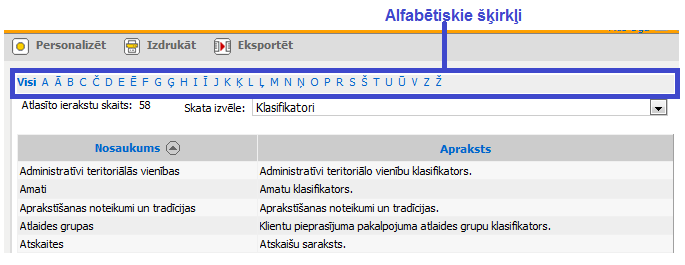 − Alfabētiskiem šķirkļiem – nodrošina iespēju atlasīt pēc alfabēta (skat. aprakstu 3.1.1 Alfabētiskie šķirkļi).