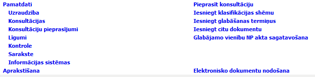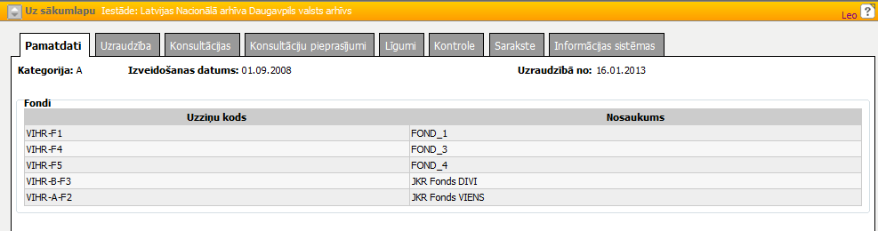 Noklikšķinot portāla sākumlapā uz hipersaites, tiek atvērts logs datu apskatei vai apstrādei. Detalizēta informācija par logā redzamajiem datiem un tajos veicamajām darbībām ir aprakstīta pie konkrētā loga apraksta. Objektu logos informācija var tikt grupēta šķirkļos. Lai apskatītu vai apstrādātu atvērtā loga cita šķirkļa datus, noklikšķiniet uz šķirkļa nosaukuma. |