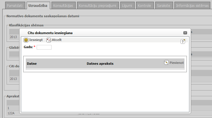 Aizpildot objekta logā datus, dažos gadījumos tiek atvērti uznirstošie logi, kuros var aizpildīt papildu datus. Uznirstošie logi tiek parādīti virs objekta loga. Objekta logā nevar veikt nekādas darbības, kamēr ir atvērts uznirstošais logs. Pēc nepieciešamo darbību veikšanas uznirstošajā logā, aizveriet to un sistēma atgriezīsies iepriekš atvērtajā objekta logā. |
