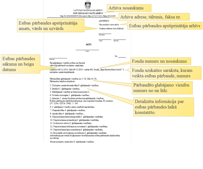 Atskaite ‘Akts par lietu esības un fiziskā stāvokļa pārbaudi’ ir paredzēta informācijas attēlošanai par fonda uzskaites saraksta glabājamo vienību esības un fiziskā stāvokļa pārbaudes rezultātiem.