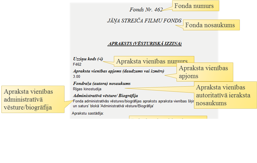 Atskaite ‘Apraksts (vēsturiskā izziņa)’ ir paredzēta sistēmā reģistrētā apraksta – fonda vai sērijas informācijas attēlošanai. Atskaitē attēlojamā apraksta vienības apraksta informācija tiek uzturēta attiecīgās apraksta vienības ierakstā. Atskaitē tiek attēlota tā apraksta vienības, informācija, kas aizpildīta apraksta vienības ierakstā.