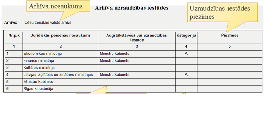 Lai izveidotu atskaiti ‘Arhīva uzraudzības iestādes’, kurā attēlo arhīva uzraugāmo iestāžu pamatinformāciju (nosaukumu, augstākstāvošo institūciju, iestādes kategoriju un piezīmes):