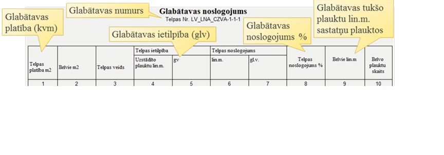 Atskaite ‘Atskaite par glabātavas noslogojumu’ ir paredzēta informācijas attēlošanai par glabātavu, tās platību, brīvajiem kvadrātmetriem, ietilpību, noslogojumu, brīvajiem plauktiem un brīvajiem lineārajiem metriem.