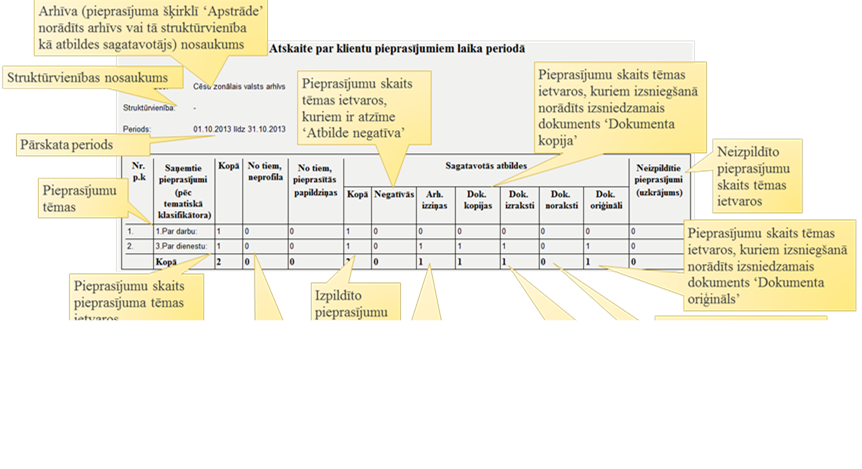 Atskaite ‘Atskaite par klientu pieprasījumiem laika periodā’ ir paredzēta informācijas attēlošanai par arhīva struktūrvienības saņemtajiem klientu pieprasījumiem norādītajā periodā, kur pieprasījumi tiek grupēti pēc pieprasījuma tēmas. Izveidotajā atskaitē par katru pieprasījuma tēmu attēlo arhīvā vai struktūrvienībā saņemto klientu pieprasījumu skaitu kopā un cik no kopskaita pieprasījumiem ir neprofila, t.i., atbildes sagatavotājs ir cita organizācija, un cik pieprasījumiem ir pieprasītas papildziņas. Katrai pieprasījuma tēmai tiek attēlots arī pieprasījumu skaits pēc sagatavotā atbildes veida un neizpildīto uzdevumu skaits. Atskaites saraksta pēdējā rindā attēlo visu atlasīto vērtību kopsummas. Atskaites atlases parametrus šajā logā ir iespējams mainīt, skatīties augstāk tekstā par atskaites sagatavošanu.