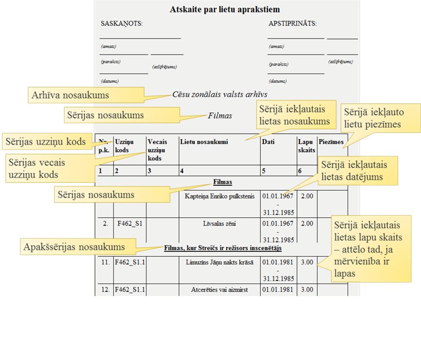 Atskaite ‘Atskaite par lietu aprakstiem’ ir paredzēta informācijas attēlošanai par sērijā iekļautajām lietām, kuras tiek grupētas pa apakšsērijām. Izveidotajā izdrukā, katrai lietai attēlo sērijas , kurā tā iekļauta, uzziņu kodu un veco uzziņu kodu. Par katru lietu attēlo tās nosaukumu, datējumu, apjomu (ja norādītas lapas) un piezīmes.