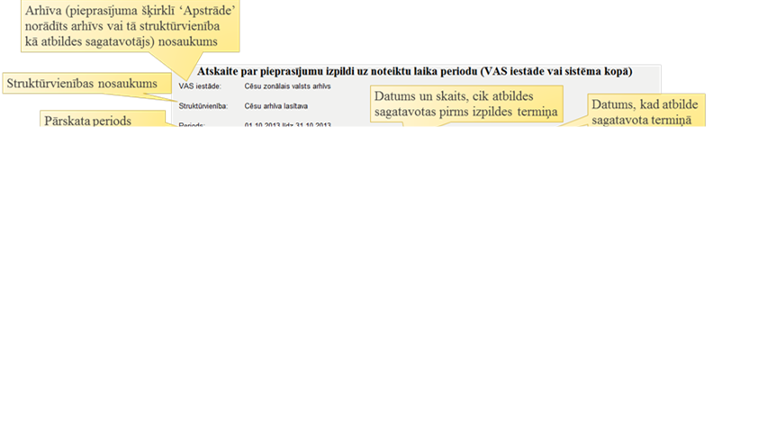 Atskaite ‘Atskaite par pieprasījumu izpildi uz noteiktu laika periodu (VAS iestāde vai sistēma kopā)’ ir paredzēta informācijas attēlošanai par arhīva struktūrvienības vai sistēmā kopā saņemto klienta pieprasījumu izpildi norādītajā periodā. Par katru arhīva/struktūrvienības saņemto klienta pieprasījumu attēlo, tā reģistrācijas datumu, numuru, atbildes sagatavotāja iestādes vai struktūrvienības nosaukumu, pieprasījuma izpildes termiņu, informāciju vai atbilde uz pieprasījumu ir sagatavota pirms termiņa, termiņā vai pēc termiņa, vai atbilde ir apmaksāta un izsniegta. Atskaites saraksta pēdējā rindā attēlo visu atlasīto vērtību skaitu.
