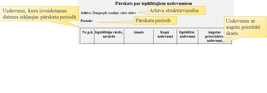 Lai izveidotu atskaiti ‘Pārskats par izpildītajiem uzdevumiem’, kurā attēlo informāciju par arhīva lietotāju izpildītajiem uzdevumiem: