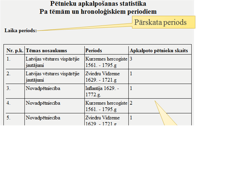 Atskaitē pieprasījumus kārto pēc pētījuma tēmas un pētāmās tēmas hronoloģiskā perioda.