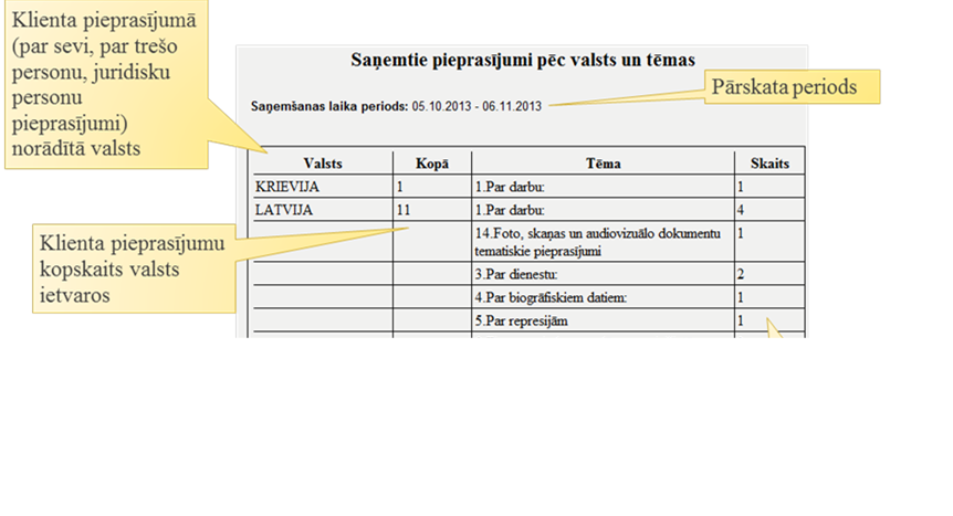 Atskaitē pieprasījumus kārto pēc pieprasījumos norādītās valsts un pieprasījuma tēmas augošā secībā.
