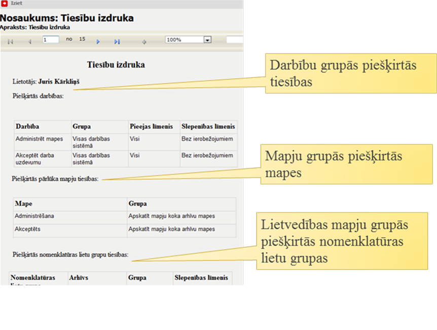 Atskaite ‘Tiesību izdruka’ ir paredzēta informācijas attēlošanai par lietotājam piešķirtajām tiesībām uz tiesību grupu darbībām, uz pārlūka mapju un lietvedības mapju tiesību grupu mapēm.