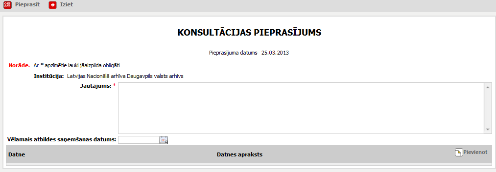 4. Noklikšķiniet uz [Pieprasīt], lai iesniegtu konsultācijas pieprasījumu Latvijas Nacionālajam arhīvam.