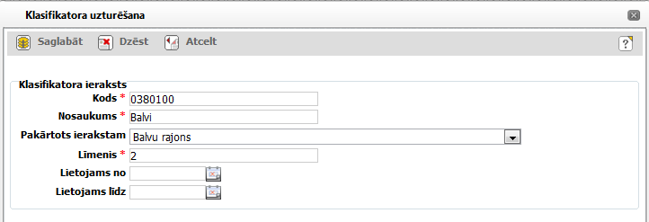 5. Klasifikatora uzturēšanas formas blokā ‘Klasifikatora ieraksts’ labojiet datus par klasifikatora ierakstu. Šajā blokā no sistēmā sagatavotajiem klasifikatora konfigurācijas datiem attēlo izvēlētajam klasifikatoram atbilstošos klasifikatora ieraksta uzturēšanas ievadlaukus. Katra klasifikatora lauku kopumu un to secību var apskatīties nodaļā skat. aprakstu 32.25. Klasifikatora lauki.