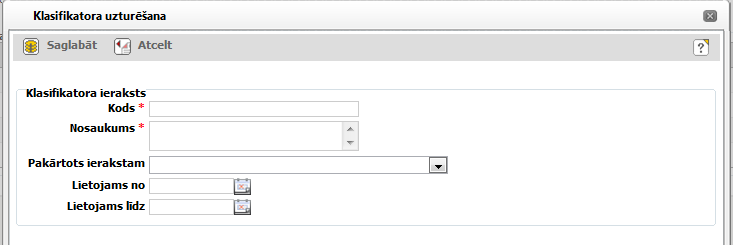 4. Klasifikatora uzturēšanas formas blokā ‘Klasifikatora ieraksts’ aizpildiet visus laukus, norādot datus par pievienojamo klasifikatora ierakstu. Šajā blokā no sistēmā sagatavotajiem klasifikatora konfigurācijas datiem attēlo izvēlētajam klasifikatoram atbilstošos klasifikatora ieraksta uzturēšanas ievadlaukus. Katra klasifikatora lauku kopumu un to secību var apskatīties nodaļā 32.25. Klasifikatora lauki.
