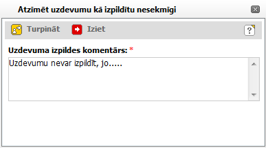 2. Uzdevuma logā (skat. aprakstu 27.1 Logs: Uzdevums) noklikšķiniet uz [Atzīmēt nesekmīgu izpildi], tiek atvērts logs izpildes komentāra ievadei: