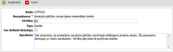 Maksimālais attēlojamo ierakstu skaits saraksta pārlūka vienā lapā (skat. aprakstu 3.1 Saraksta pārlūks). |