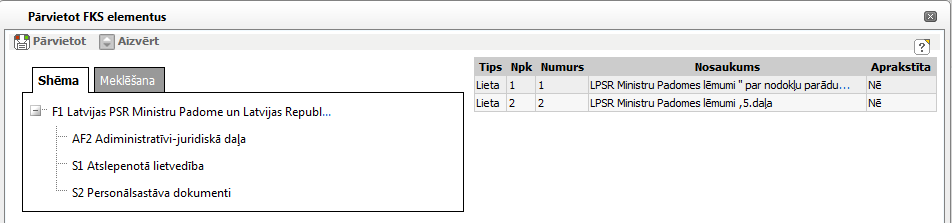 Bloks apraksta vienības, uz kuru pārvietot aprakstīšanas shēmas elementus, norādīšanai. Bloks sastāv no 2 šķirkļiem: ‘Shēma’ un ‘Meklēšana’. |