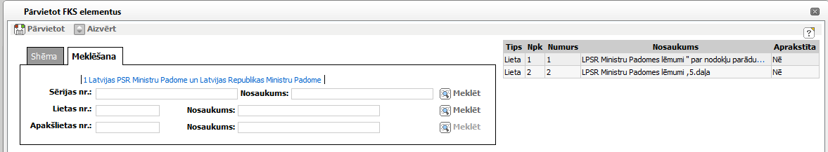 Noklikšķinot atrastā sērija tiek dzēsta no apraksta vienības piesaistīšanas bloka. Ja ir norādīta lieta vai apakšlieta, tiek dzēsti arī šie atrastie objekti no apraksta vienības piesaistīšanas bloka Pieejama, ja sērija ir atrasta. |