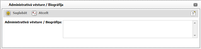 Aizpildiet apraksta vienības administratīvo vēsturi un biogrāfiju un noklikšķiniet uz [Saglabāt]. Logs tiek aizvērts, pievienojot aprakstu apraksta vienībai.