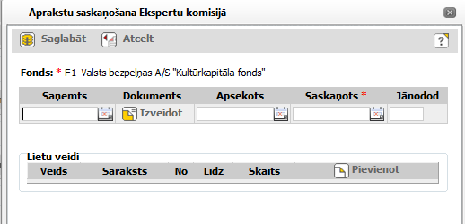 Lai pievienotu jaunu ciklu, iestādes loga šķirkļa Uzraudzība blokā Aprakstu saskaņošana ekspertu komisijā noklikšķiniet uz [Pievienot]. Lai uzskaites sarakstam varētu pievienot jaunas glabājamās vienības, saraksts vispirms jāizveido (skat. aprakstu 10.2Scenārijs: Jauna glabājamo vienību uzskaites saraksta izveide).