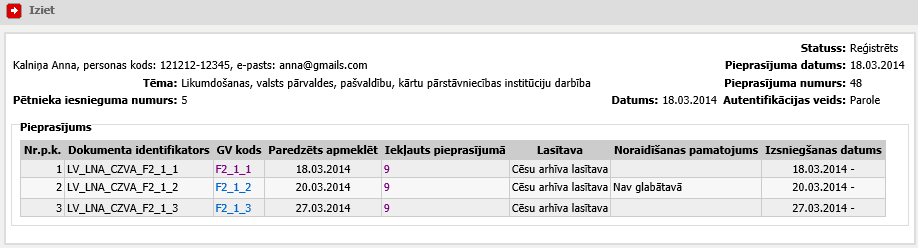 Par Latvijas pilsoni attēlo uzvārdu un vārdu, personas kodu un e-pastu. Par ārvalstu pilsoni attēlo uzvārdu un vārdu, identifikācijas kodu un e-pastu. |