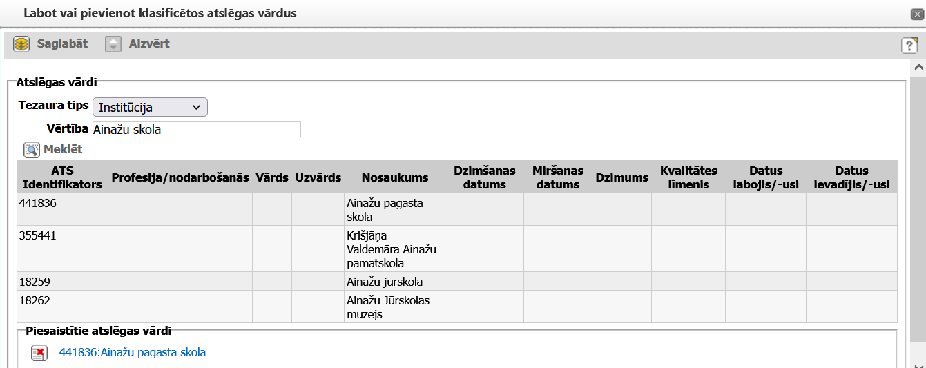Atlasīto atslēgas vārdu saraksts. Noklikšķinot uz ieraksta, tiek atvērts uznirstošais logs ATS atslēgvārda apskatei un piesaistei (skat. attēlu zemāk). |