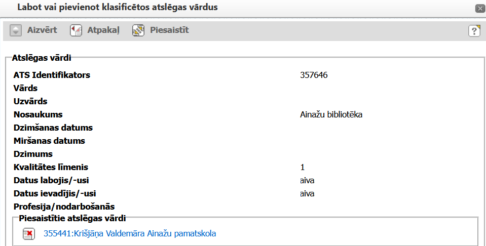 Logs paredzēts klasificēto atslēgas vārdu no ATS atlasei, piesaistīšanai un dzēšanai jeb atsaistīšanai no apraksta vienības.