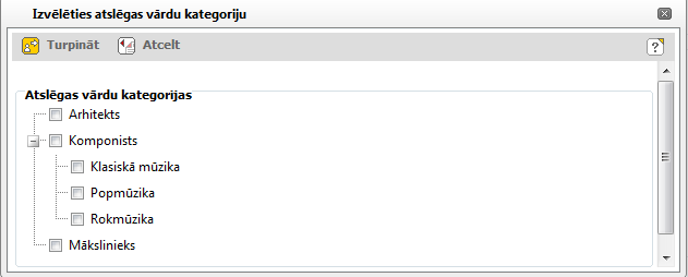 Atslēgas vārdu kategorijas. Vērtību izvēle no klasifikatora ‘Atslēgas vārdu kategorijas’. Ja kādam no atslēgas vārdu kategorijas klasifikatora ir zemāka līmeņa atslēgas vārda kategorijas, tad tam tiek blakus attēlota "+" zīme, ko izmanto, lai izvērstu klasifikatora līmeni. Ja kāds klasifikatora līmenis ir izvērsts, tad tam blakus tiek attēlota "-" zīme, ko izmanto, lai savērstu klasifikatora līmeni. |