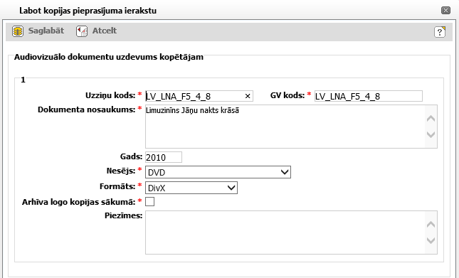 Uznirstošais logs „Audiovizuālo dokumentu uzdevuma kopētājam labošana” paredzēts uzdevuma audiovizuālo dokumentu kopētājam labošanai. Uzdevumā tiek iekļauti dokumenti kopēšanai, kuriem ir statuss ‘Apstiprināts’. Atverot logu, pēc noklusējuma ir vērtības ir aizpildītas ar šķirklī ‘Uzdevums kopētājam’ kopējamā dokumenta informāciju.
