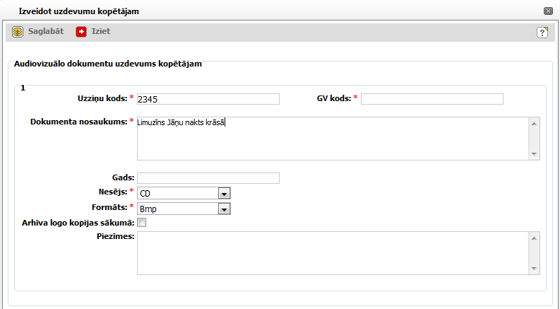 Uznirstošais logs „Audiovizuālo dokumentu uzdevums kopētājam” paredzēts uzdevuma audiovizuālo dokumentu kopētājam izveidei. Uzdevumā tiek iekļauti dokumenti kopēšanai, kuriem ir statuss ‘Iesniegts’. Atverot logu, pēc noklusējuma ir vērtības ir aizpildītas ar šķirklī ‘Pieprasījums’ kopējamā dokumenta informāciju.