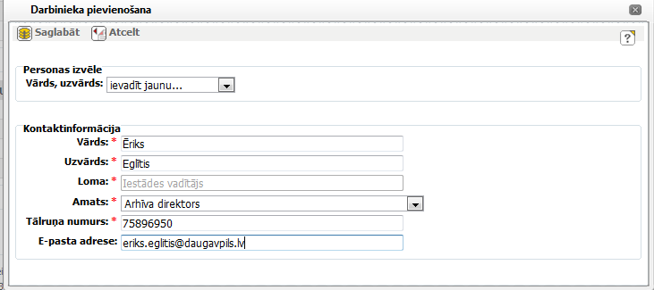 Lai pievienotu jaunu kontaktpersonu, iestādes loga šķirklī ‘Pamatdati’ noklikšķiniet uz [Pievienot] blokā ‘Kontaktpersonas’ vai blokā ‘Atbildīgie par dokumentu saglabāšanu (arhīvu)’.