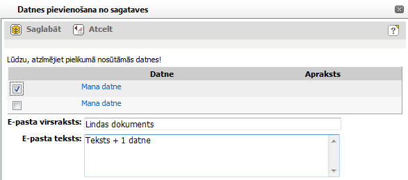 Dokumentam pievienoto datņu nosaukums kā hipersaite, uz kuras noklikšķinot, datne tiek atvērta. Pirms katras vērtības attēlo izvēles rūtiņu, kuru atzīmē, ja datne pievienojama e-pastam. |